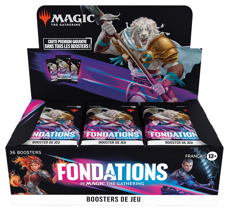 Boite de 36 boosters de jeu Fondations de Magic: The Gathering en français. Le Boosters de jeu - Fondations de Magic: The Gathering combine la jouabilité des boosters de draft au fun de l’expérience d’ouverture des boosters d’extension. Il remplace ces deux types de boosters.